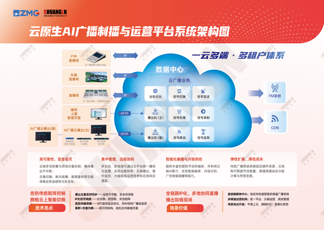 依托与浙江广电的深度合作,以云架构重塑广播播出体系,助力市县级融媒体中心、多频道广播机构迈入“智能化、高可靠、轻运营”新时代。