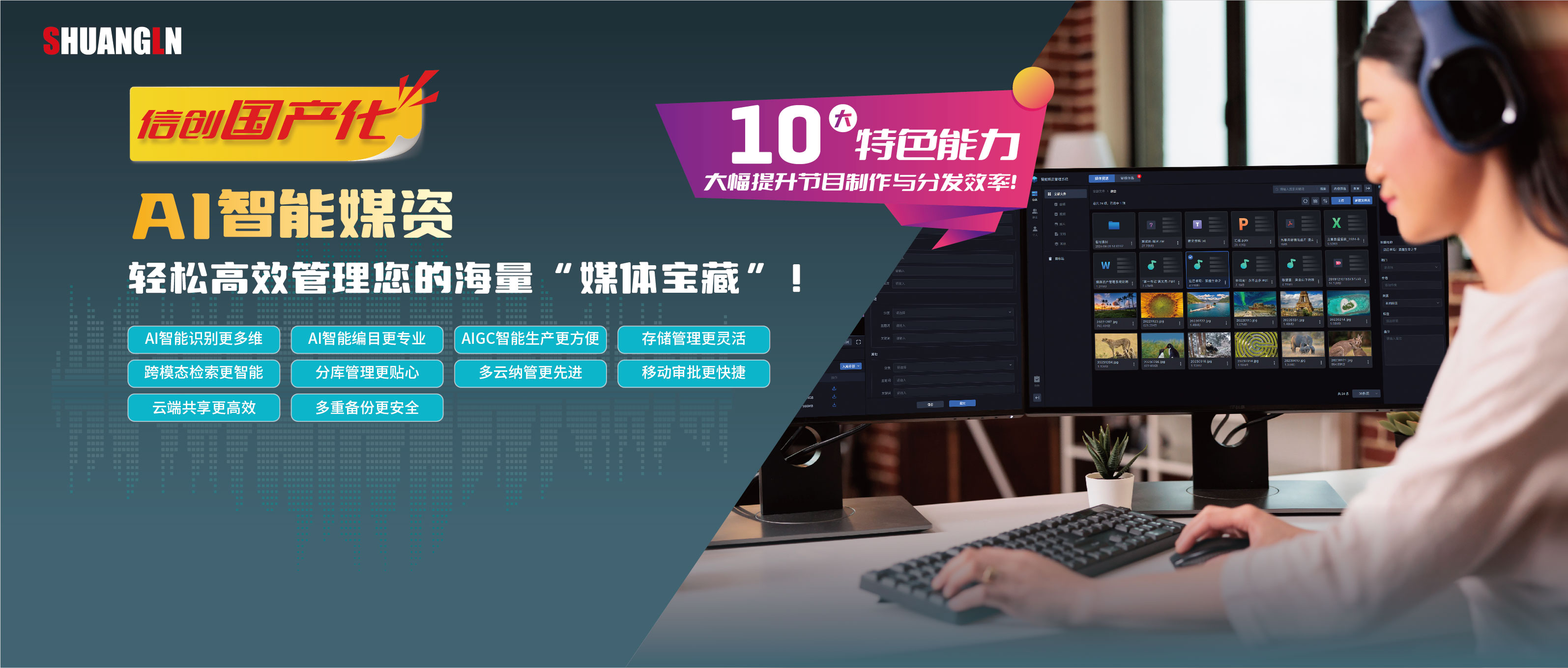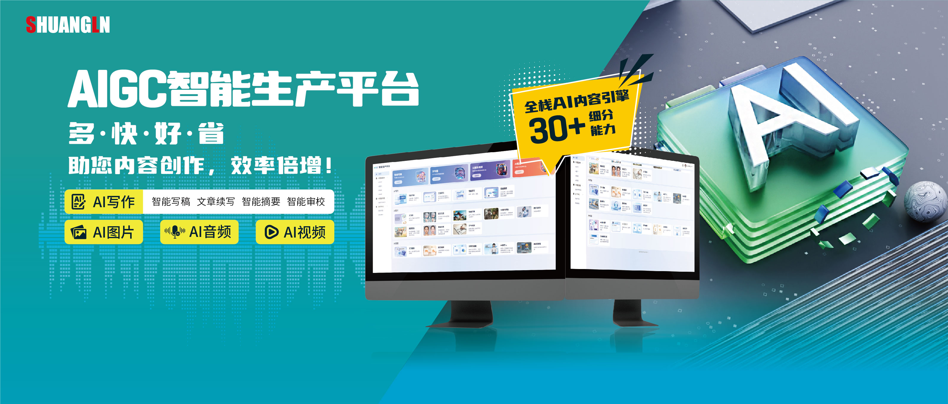 双菱AIGC智能生产平台,集成AI写作、智能配音、视频自动剪辑、图文生成等30余项能力,大幅降低内容生产门槛。助力县级广电以低成本、高效率产出海量优质内容,解放生产力,专注创意与深度报道。