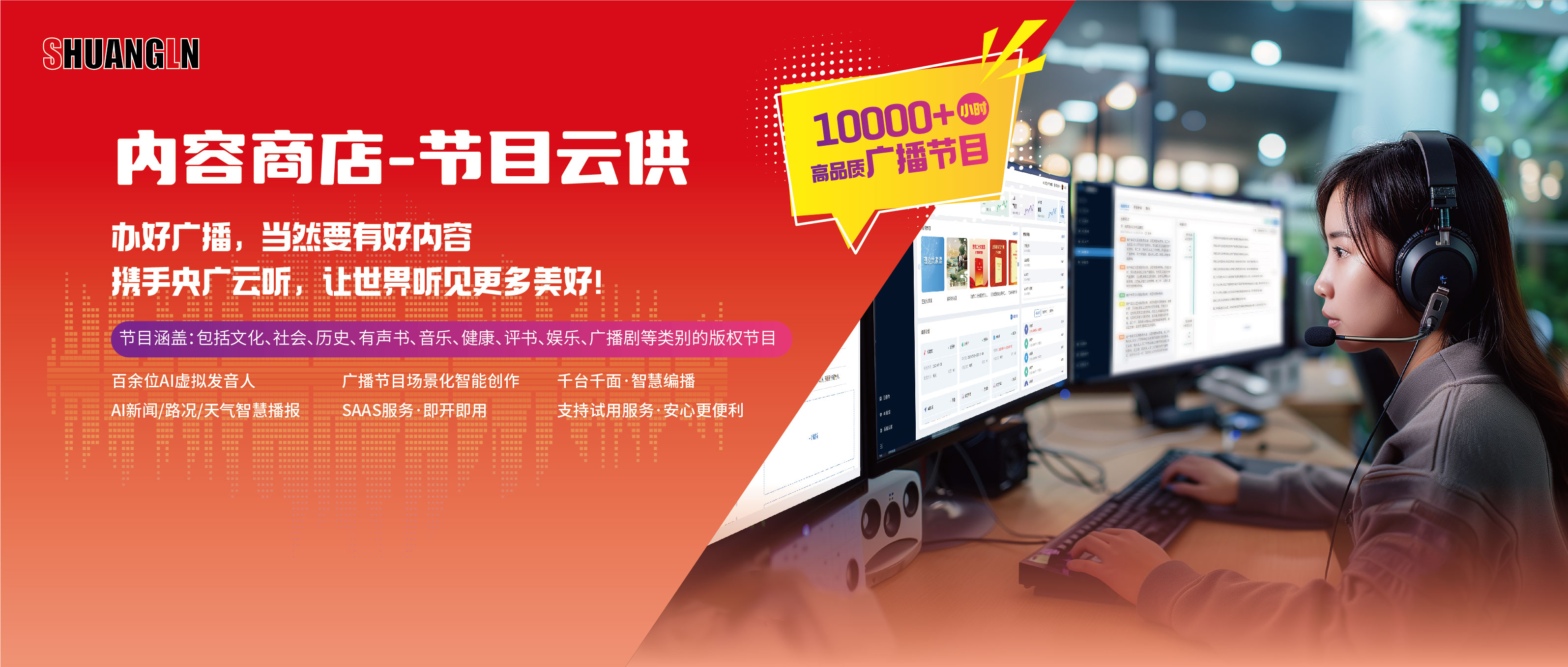 湖南双菱面向市县级广电的内容云供平台。提供优质广播节目、模板资源,支持上传、交换,在线开通与购买,即开即用,解决基层广播媒体“缺内容、缺主播、节目制作成本高的痛点。