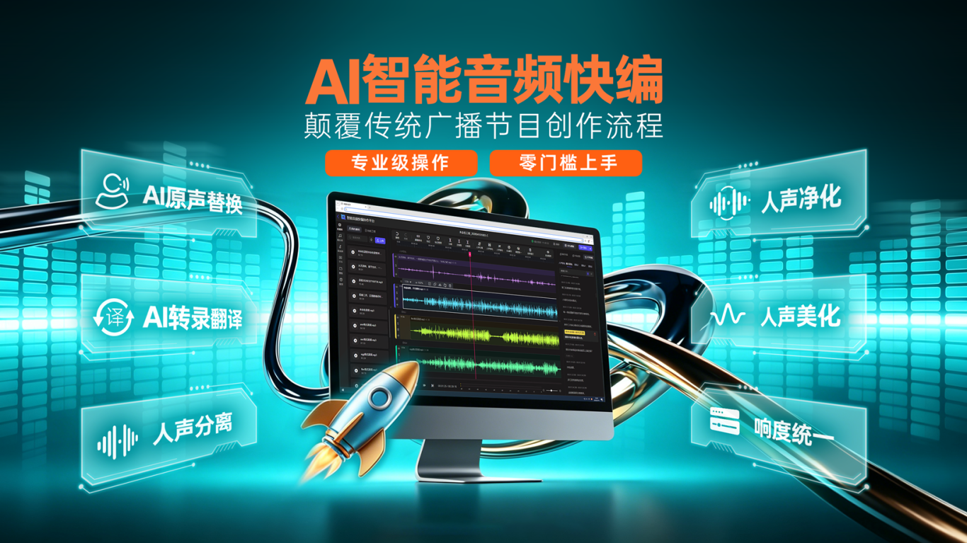 基于AI的音频快速编辑工具,智能降噪、语音转文字、音色替换、智能补录、多轨剪辑。适用于广播节目制作、播客生产、音频新闻、国际化多语种制作等场景,让非专业编辑也能快速产出专业级音频,效率提升5倍以上。