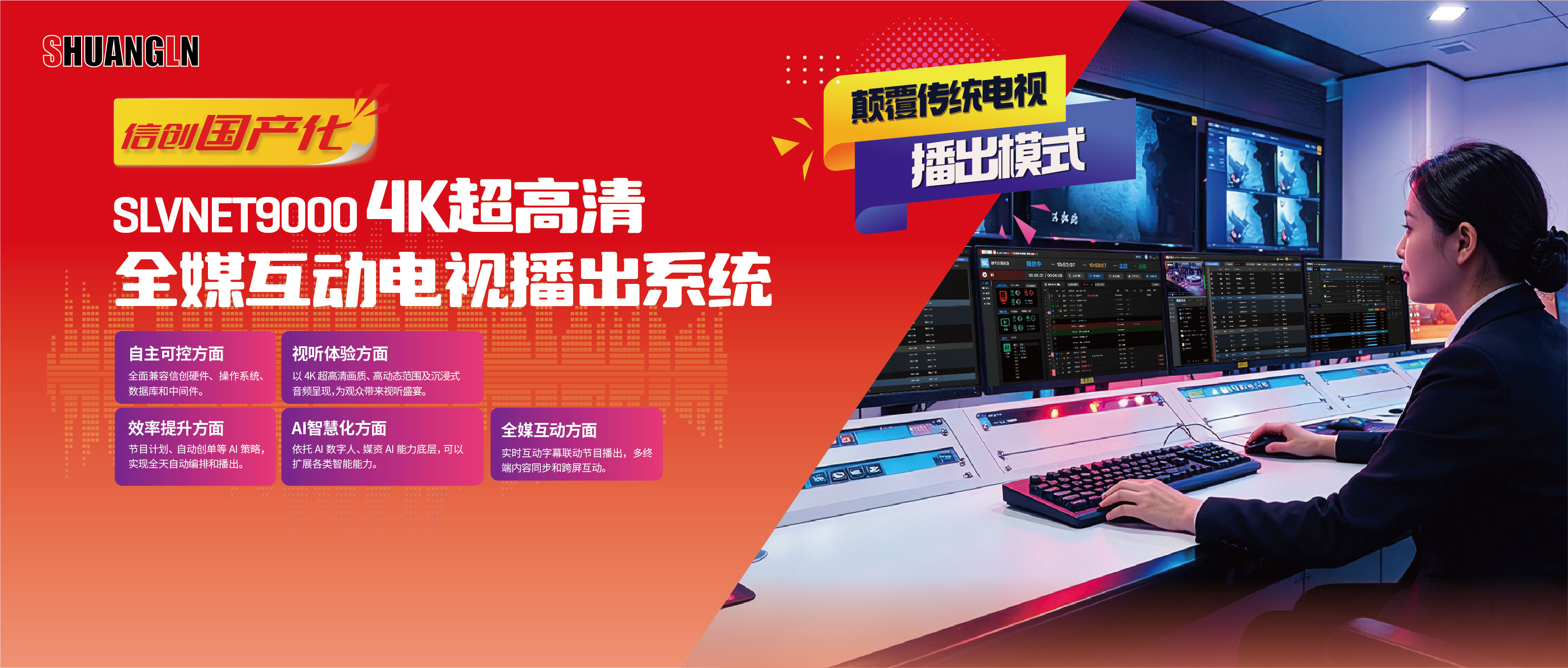 湖南双菱重磅新品,支持4K超高清信号播出,融合大屏小屏,多屏互动、图文字幕实时发布、深度融合AI数字人,智能媒资等能力。满足县级融媒体中心对高画质、强互动的播出需求,轻松应对全媒体时代的多样化互动与运营需求。